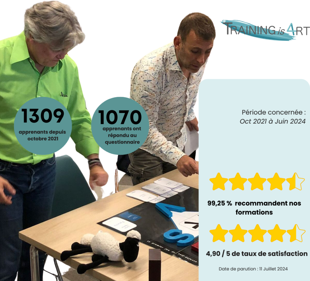 L’expérience pédagogique unique que nous créons pour vous s’appelle “entrer dans le livre“. Au fur et à mesure des expérimentations, mises en situation, et entrainements, les contenus essentiels sont affichés sur les murs sous forme de panneaux synthèse que nos participants semble adorer prendre en photo. Au-delà de la sensation d’être dans l’ouvrage, s’ajoute l’intérêt immédiatement pratique pour, à la fois, mémoriser les éléments à acquérir et la possibilité d’y faire référence tout au long du parcours pédagogique. Parmi les retours d’expérience de nos clients les plus enthousiastes, cette méthode, signature de Training is Art, est plébiscitée.